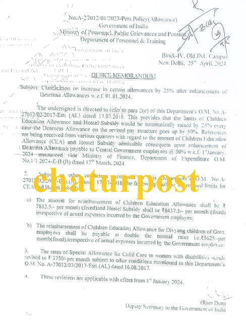 अफसरों के अनुसार अखिल भारतीय सेवा के अफसरों को उनके बच्चों की शिक्षा के लिए भत्ता और छात्रावास सब्सिडी दी जाती है। केंद्र सरकार ने इसमें वृद्धि का आदेश जारी किया है। डीओपीटी से जारी आदेश के बाद राज्य के सामान्य प्रशासन विभाग ने भी इसे लागू करने का आदेश जारी कर दिया है।
