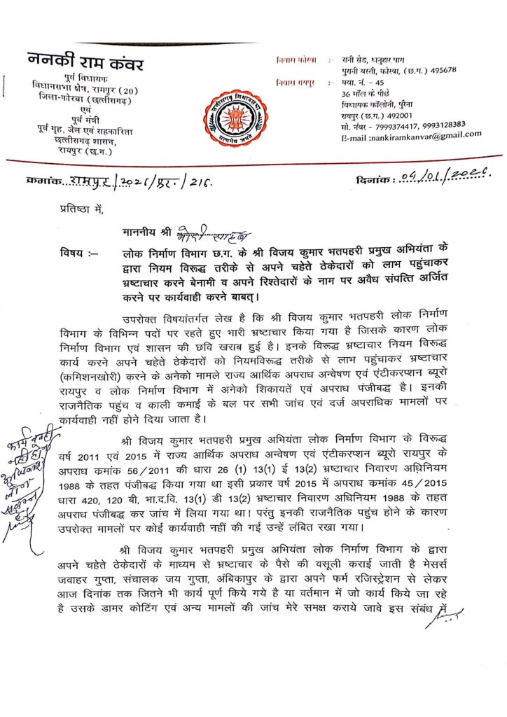 कंवर ने लिखा है कि विजय कुमार भतपहरी प्रमुख अभियंता लोक निर्माण विभाग के विरूद्ध वर्ष 2011 एवं 2015 में राज्य आर्थिक अपराध अन्वेषण एवं एंटीकरप्शन ब्यूरो रायपुर के अपराध क्रमांक 56/2011 की धारा 26 (1) 13 (1) ई 13(2) भ्रष्टाचार निवारण अधिनियम 1988 के तहत पंजीबद्ध किया गया था इसी प्रकार वर्ष 2015 में अपराध कमांक 45/2015 धारा 420, 120 बी, भा.द.वि. 13 (1) डी 13 (2) भ्रष्टाचार निवारण अधिनियम 1988 के तहत अपराध पंजीबद्ध कर जांच में लिया गया था। परंतु इनकी राजनैतिक पहुंच होने के कारण इन मामलों पर कोई कार्यवाही नहीं की गई उन्हें लंबित रखा गया।