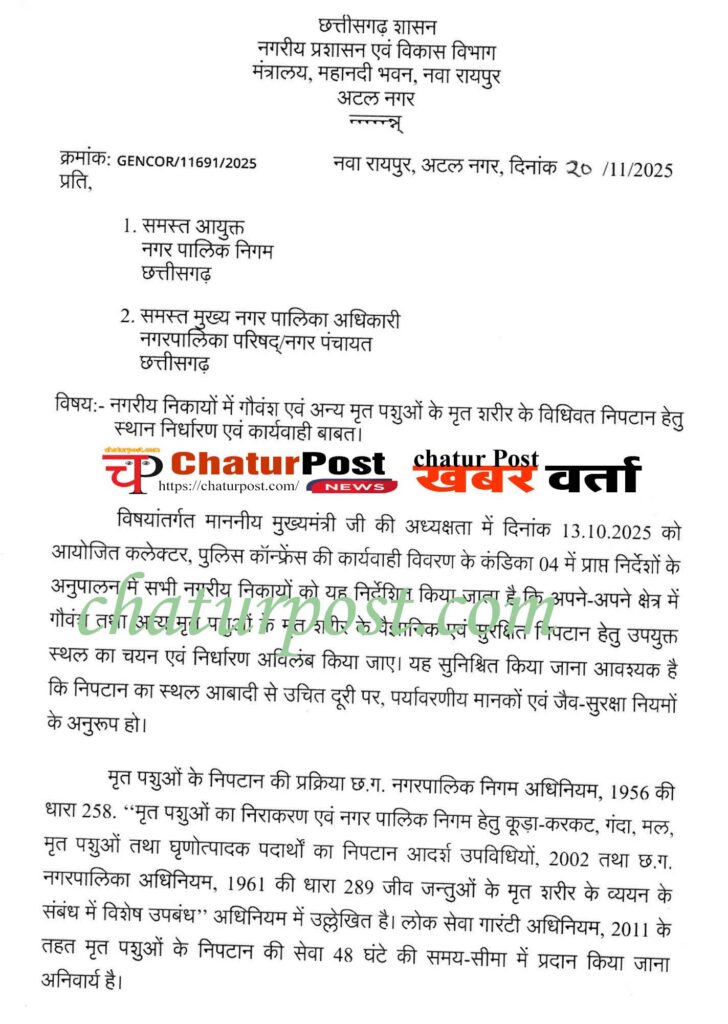 नगरीय प्रशासन विभाग ने सभी नगरीय निकायों को निर्देश दिया है कि अपने-अपने क्षेत्र में गोवंश और अन्य मृत पशुओं के मृत शरीर के वैज्ञानिक और सुरक्षित निपटान के लिए उपयुक्त स्थल का चयन और निर्धारण तुरंत करें।