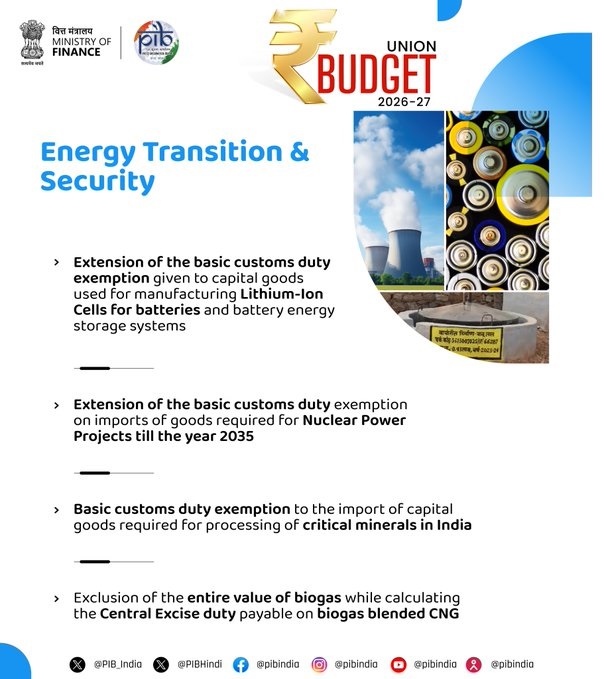 अप्रत्यक्ष कर उपायों में, केंद्रीय वित्त मंत्री ने एनर्जी ट्रांज़िशन और सुरक्षा के लिए बेसिक कस्टम्स ड्यूटी और सेंट्रल एक्साइज ड्यूटी में सुधार का प्रस्ताव दिया।