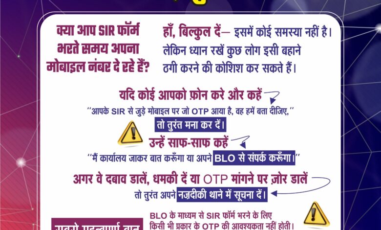 विभाग ने स्पष्ट किया है कि SRI एसआईआर फॉर्म भरते समय मोबाइल नंबर Mobile Number देना पूरी तरह से सुरक्षित है, लेकिन नागरिकों को विशेष रूप से alert सतर्क रहने की आवश्यकता है क्योंकि कुछ साइबर अपराधी cybercriminals इसी बहाने ठगी करने की कोशिश कर सकते हैं।
