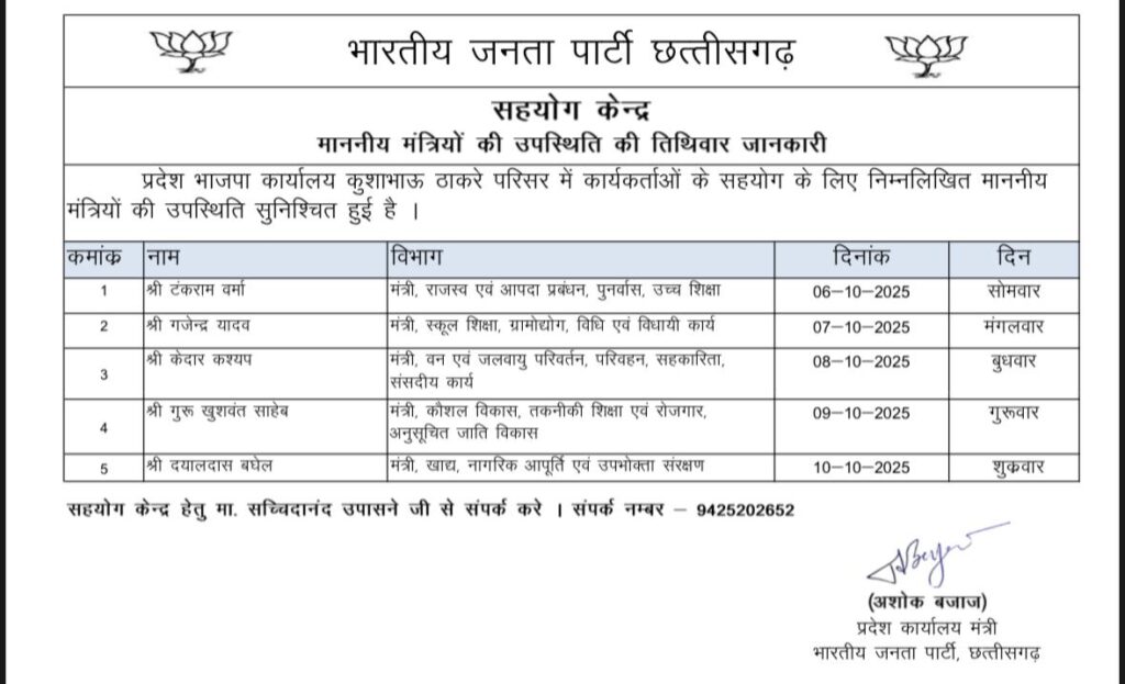 CG BJP कार्यालय में फिर से शुरू हो रहा है सहयोग केंद्र: 6 अक्टूबर को टंकराम वर्मा, 7 का गजेंद्र यादव, देखिए पूरी सूची