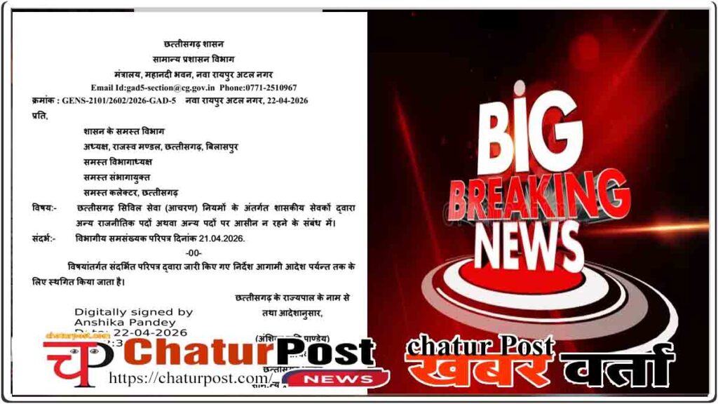 रायपुर (Chaturpost): छत्तीसगढ़ सरकार ने शासकीय सेवकों (Government Servants) के लिए जारी एक विवादित आदेश को महज 24 घंटे के भीतर वापस ले लिया है। सामान्य प्रशासन विभाग (GAD) द्वारा कल जारी किए गए उस निर्देश को फिलहाल स्थगित (Suspended) कर दिया गया है, जिसमें कर्मचारियों के किसी भी राजनीतिक दल या संगठन में पद धारण करने पर रोक लगाई गई थी।
