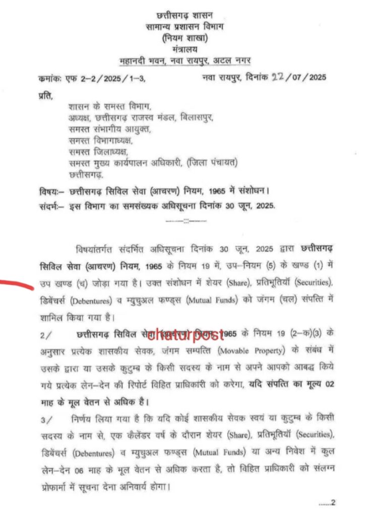 CG News रायपुर। छत्तीसगढ़ के शासकीय सेवकों को अब अपने और परिवार के सदस्यों के निवेश से संबंधित चल संपत्ति की भी जानकारी सार्वजनिक करी होगी। सरकार ने इसके लिए नियमों में बदलाव कर दिया है। शासकीय सेवकों को अब वार्षिक रिपोर्ट में यह नई जानकारी भी देनी होगी।