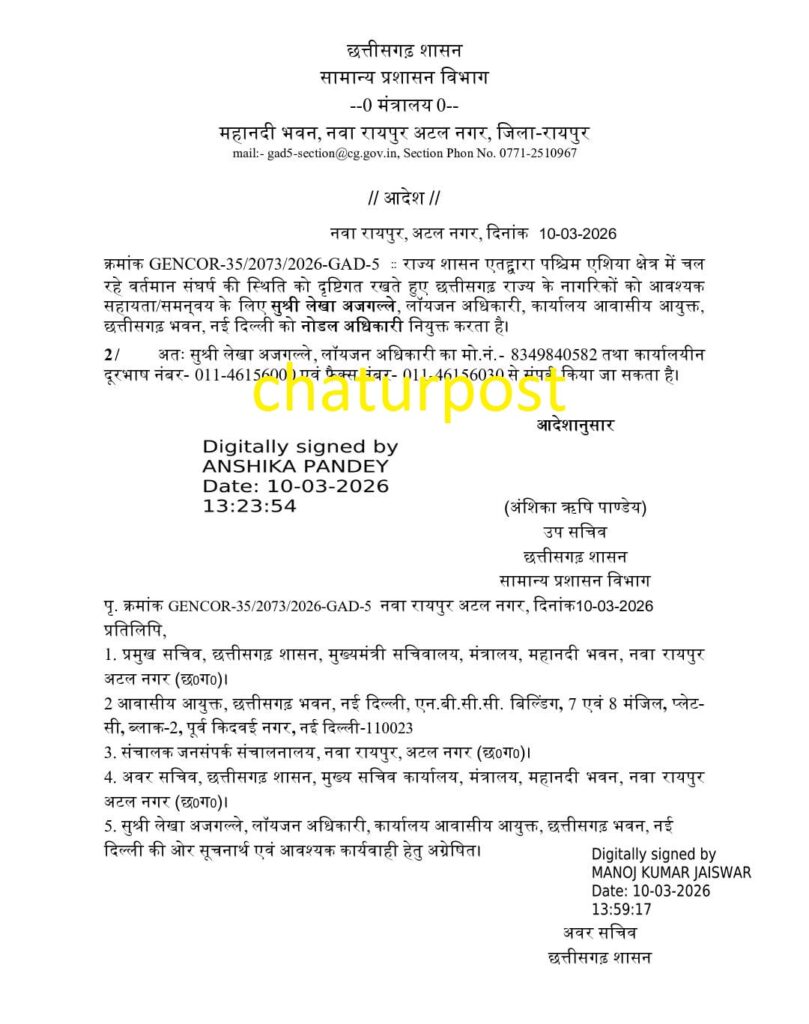 युद्ध क्षेत्र में फंसे लोगों की मद्द के लिए छत्तीसगढ़ सरकार ने नोडल अफसर की नियुक्ति की है। इसके साथ ही सरकार ने उस अफसर का नंबर भी जारी कर दिया है, ताकि आपात स्थिति में लोग संपर्क कर सकें।