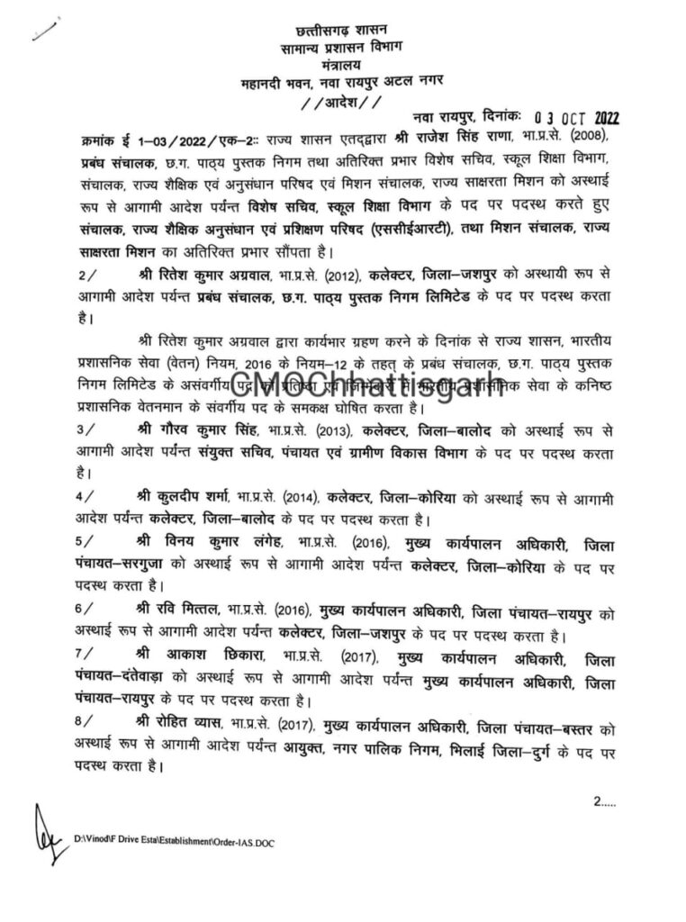 - गौरव कुमार सिंह कलेक्टर बालोद से संयुक्त सचिव पंचायत एवं ग्रामीण विकास विभाग