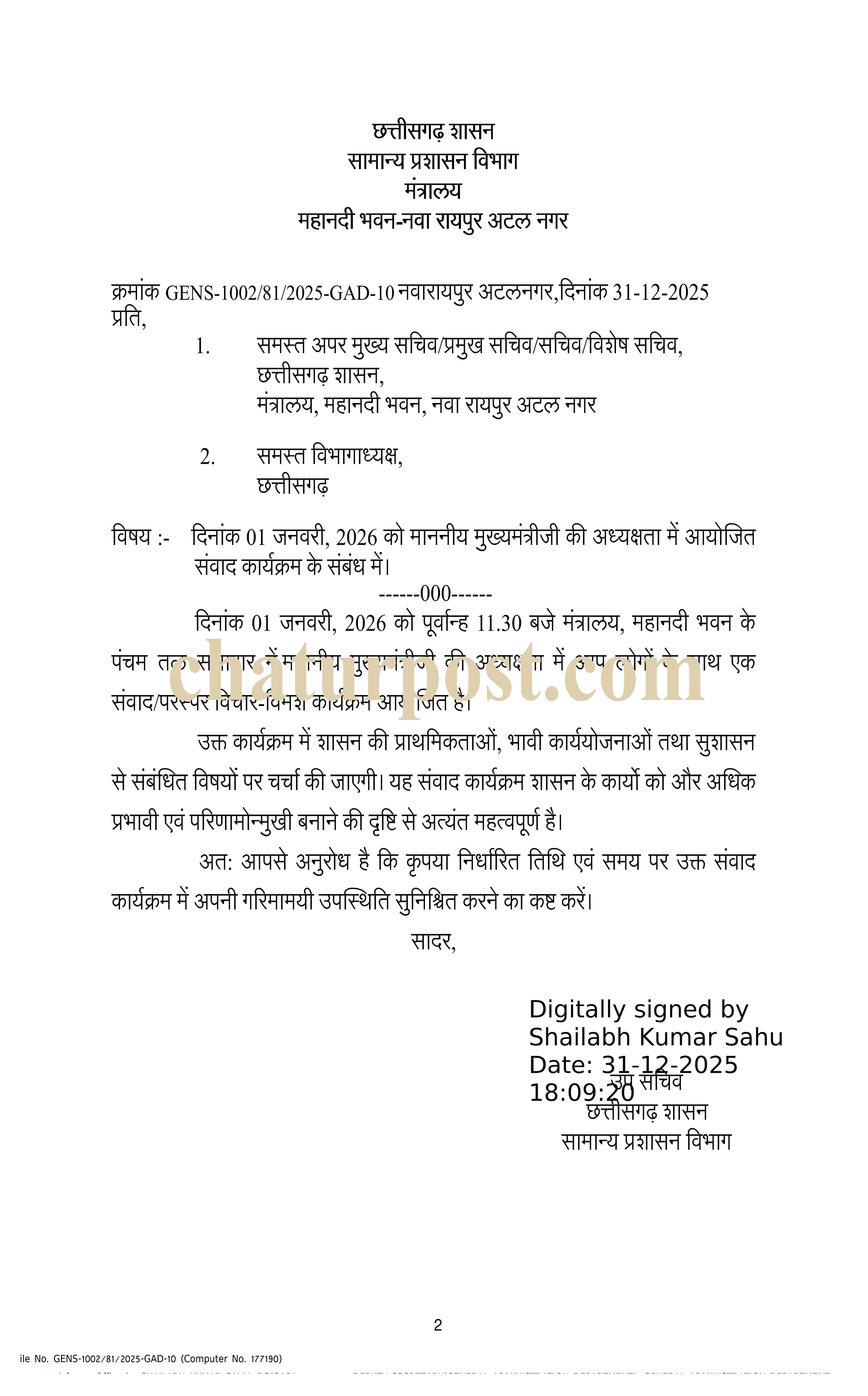 इस संबंध में सामान्य प्रशासन विभाग ने सभी अफसरों को पत्र जारी किया है। इसमें कहा गया है कि सभी अफसरों से निर्धारित तिथि और समय पर इस संवाद कार्यक्रम में अपनी गरिमामयी उपस्थिति सुनिश्चित करने के लिए कहा गया है।