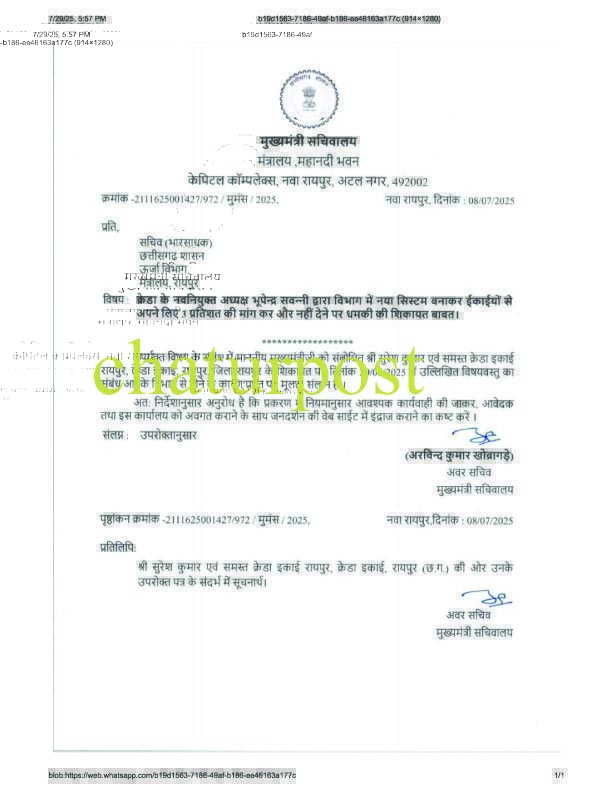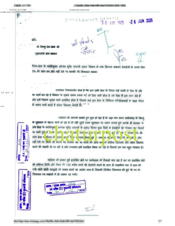 Creda रायपुर। क्रेडा यानी छत्तीसगढ़ राज्य अक्षय ऊर्जा विकास अभिकरण में कमीशनखोरी के बड़ा खेल चलने का आरोप लगा है। इस मामले में सीधे मुख्यमंत्री विष्णुदेव साय से शिकायत की गई है। इसकी प्रति प्रधानमंत्री समेत अन्य केंद्रीय नेताओं को भी भेजी गई है।