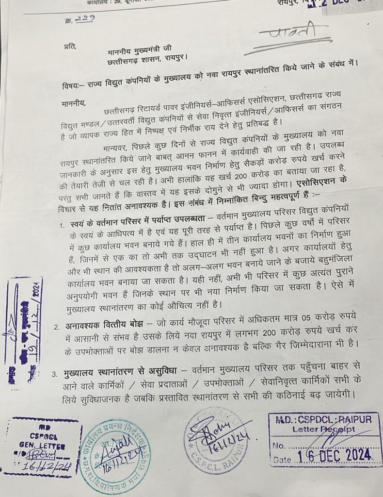 CSEB उपरोक्त परिपेक्ष्य में बिजली कंपनियों का प्रस्तावित मुख्यालय स्थानांतरण निश्चित रूप से न केवल सभी के लिये कष्टप्रद है वरन् शासन की छवि के लिये हानिकारक भी है, अतः आपसे विनम्र अनुरोध है कि कृपया तत्काल हस्तक्षेप कर जिम्मेदार अधिकारियों को मुख्यालय स्थानांतरण बाबत् चल रही समस्त गतिविधियों पर अविलम्ब रोक लगाने के लिए आदेशित करें ताकि एक ओर उपभोक्ता हितों की रक्षा की जा सके वहीं दूसरी ओर शासन की छवि धूमिल होने से बचाई जा सके।