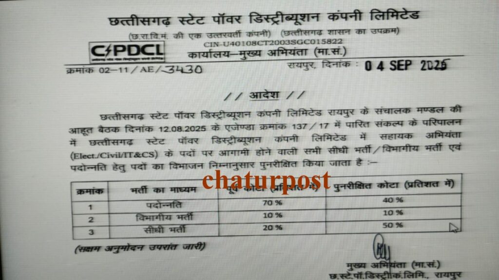 CSPDCL रायपुर। छत्‍तीसगढ़ की सरकारी बिजली वितरण कंपनी में भर्ती के कोटे में बदला कर दिया गया है। कंपनी के संचालक मंडल (BOD) की बैठक में लिए गए निर्णय के आधार कंपनी के मानव संसाधन विभाग ने आदेश जारी कर दिया है।