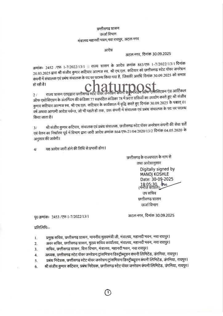 CSPGCL रायपुर। छत्तीसगढ़ की सरकारी बिजली उत्पादन कंपनी के एमडी संजीव कुमार कटियार का कार्यकाल एक वर्ष के लिए बढ़ा दिया है। ऊर्जा विभाग से जारी आदेश के अनुसार कटियार का कार्यकाल एक वर्ष के लिए बढ़ाया गया है।