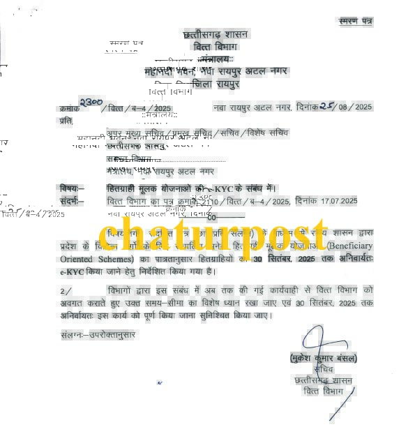 विभिन्न योजनाओं के हितग्राहियों का ई केवाईसी कराने के लिए वित्त विभाग ने 17 जुलाई को पहला पत्र जारी किया था। अब 25 अगस्त को दूसरा लेटर जारी किया गया है। यह लेटर सभी विभागों के प्रमुखों को जारी किया गया है। इसमें 30 सितंबर तक ई केवाईसी अनिवार्य रुप से पूरा कराने के लिए कहा गया है।