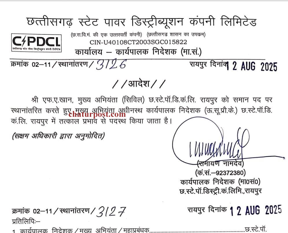 बिजली कंपनी का जो आर्डर चर्चा में है उसे वितरण कंपनी के ईडी (मानव संसाधन) ने जारी किया है। 3126 नंबर का यह स्थानांतरण आदेश 12 अगस्त को जारी हुआ है। इसमें एक चीफ इंजीनियर की कार्यपालक निदेशक के अधीन पोस्टिंग कर दी है। इसमें भी जिस चीफ इंजीनियर का ट्रांसफर किया गया है वे सिविल वाले हैं उन्हें Energy Infotech Centre (EITC) में पदस्थ कर दिया गया है।