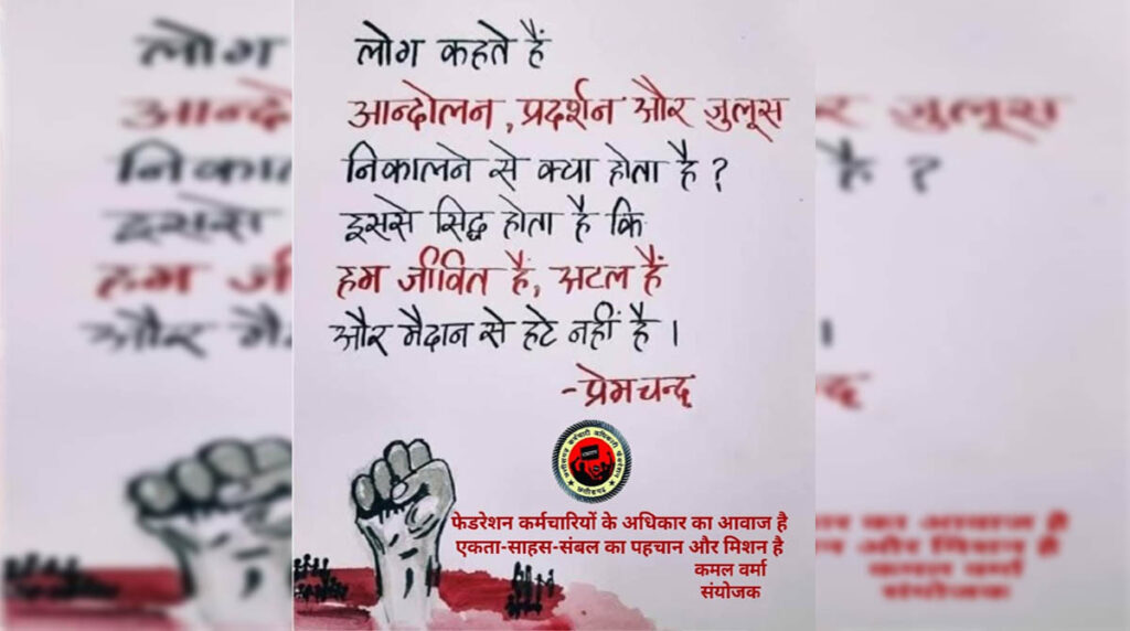 फेडरेशन की तरफ से जारी एक पोस्टर खास है। इस पोस्टर पर मुंशी प्रेमचंद की पंक्तियां हैं। लिखा है- लोग कहते हैं आंदोलन, प्रदर्शन और जुलूस निकालने से क्या होता है? इस प्रश्न का उत्तर मुंशी प्रेमचंद की पंक्तियों में देते हुए लिखा है- इससे सिद्ध होता है कि हम जीवित हैं, अटल हैं और मैदान से हटे नहीं हैं।