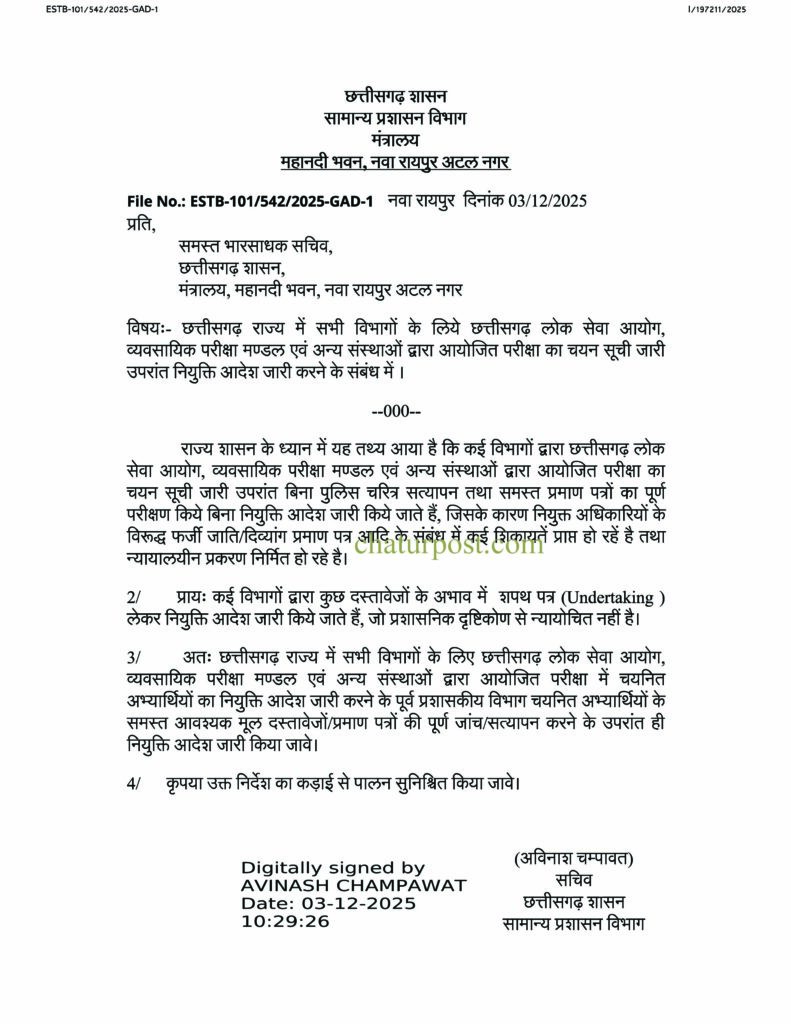 जीएडी सचिव ने अपने पत्र में लिखा है कि कई विभागों की तरफ से छत्तीसगढ़ लोक सेवा आयोग, व्यवसायिक परीक्षा मंडल समेत अन्य संस्थाओं के जरिये आयोजित परीक्षा का चयन सूची जारी होनेक के बाद बिना पुलिस चरित्र सत्यापन व समस्त प्रमाण पत्रों का पूर्ण परीक्षण किए बिना नियुक्ति आदेश जारी किए जाते हैं, जिसके कारण नियुक्त अधिकारियों के विरूद्ध फर्जी जाति/दिव्यांग प्रमाण पत्र आदि के संबंध में कई शिकायतें प्राप्त हो रहें है तथा न्यायालयीन प्रकरण निर्मित हो रहे है।