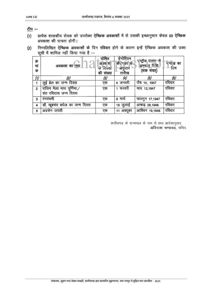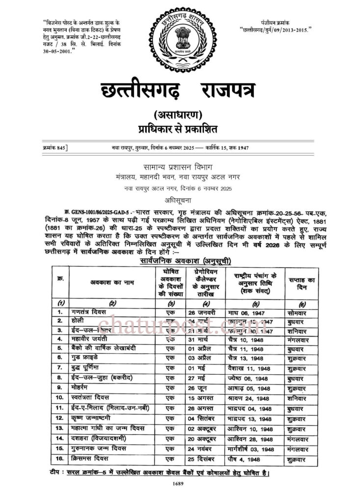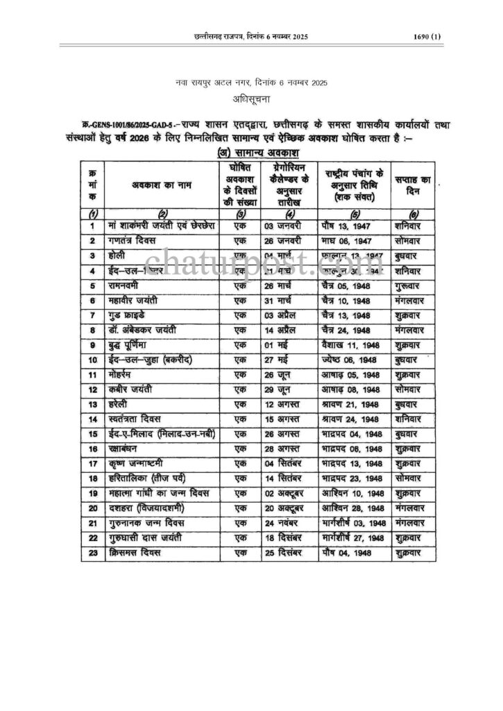 Government Holidays 2026: रायपुर। छत्तीसगढ़ सरकार ने 2026 के लिए शासकीय अवकाशों की घोषणा कर दी है।