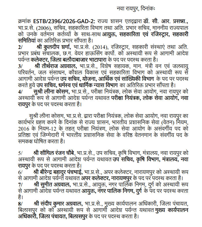 कुलदीप शर्मा, IAS(2014), रजिस्ट्रार, सहकारी संस्थाएं तथा अति. प्रभार प्रबंध संचालक, छ.ग. वेयर हाऊसिंग कार्पो. को अस्थायी रूप से आगामी आदेश पर्यन्त कलेक्टर, जिला बलौदाबाजार भाटापारा के पद पर पदस्थ करता है।