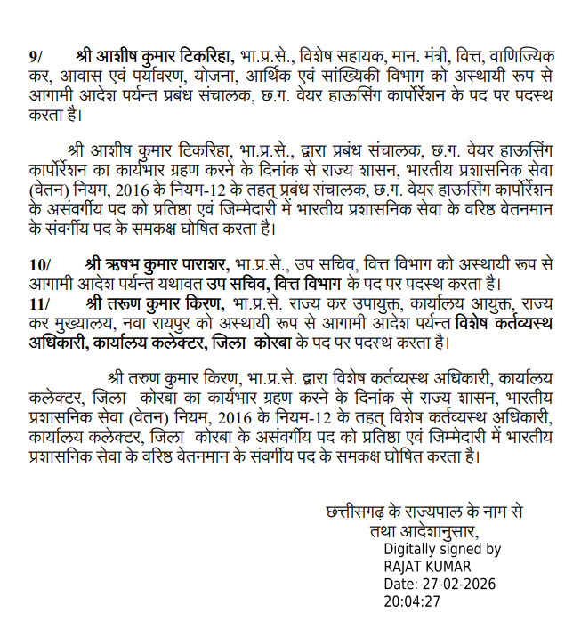 तरूण कुमार किरण, IAS राज्य कर उपायुक्त, कार्यालय आयुक्त, राज्य कर मुख्यालय, नवा रायपुर को अस्थायी रूप से आगामी आदेश पर्यन्त विशेष कर्तव्यस्थ अधिकारी, कार्यालय कलेक्टर, जिला कोरबा के पद पर पदस्थ करता है।