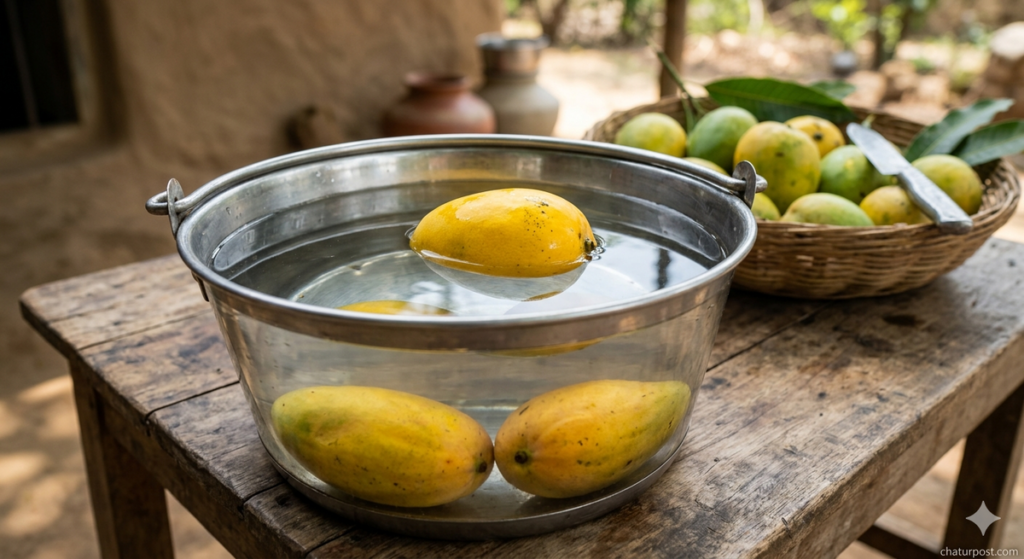 असली आम: जो आम पेड़ पर प्राकृतिक रूप से पकते हैं, वे भारी होते हैं और पानी में डालते ही डूब जाते हैं।