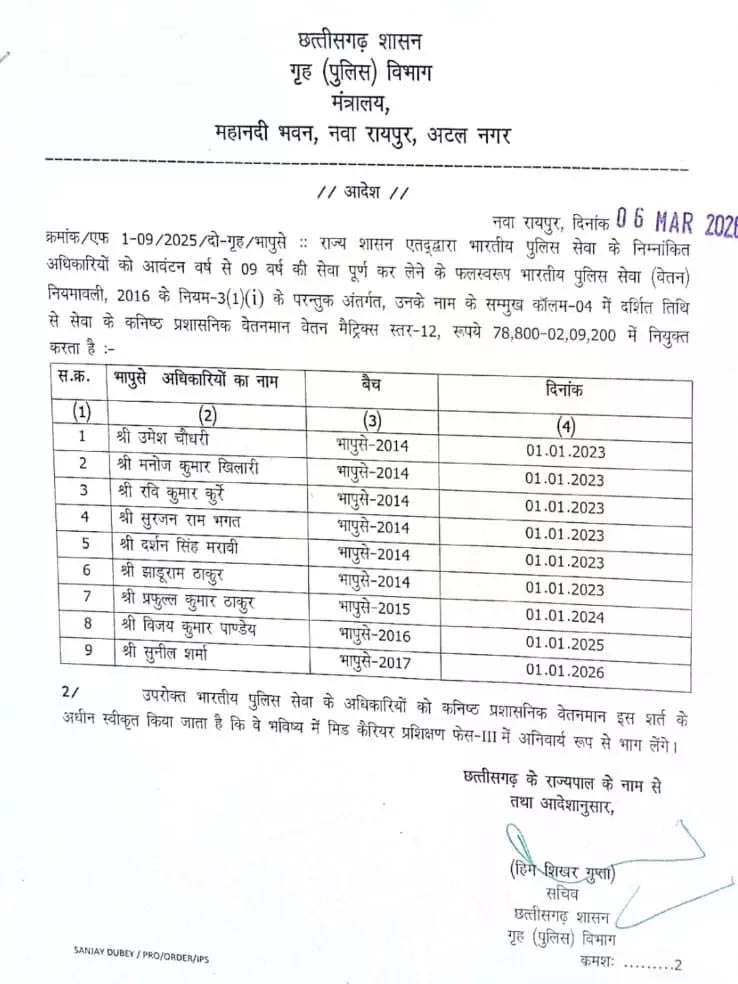 IPS रायपुर। छत्तीसगढ़ सरकार ने राज्य के नौ आईपीएस अफसरों का वेतन बढ़ा दिया है। इस संबंध में गृह विभाग की तरफ से आदेश जारी कर दिया गया है।