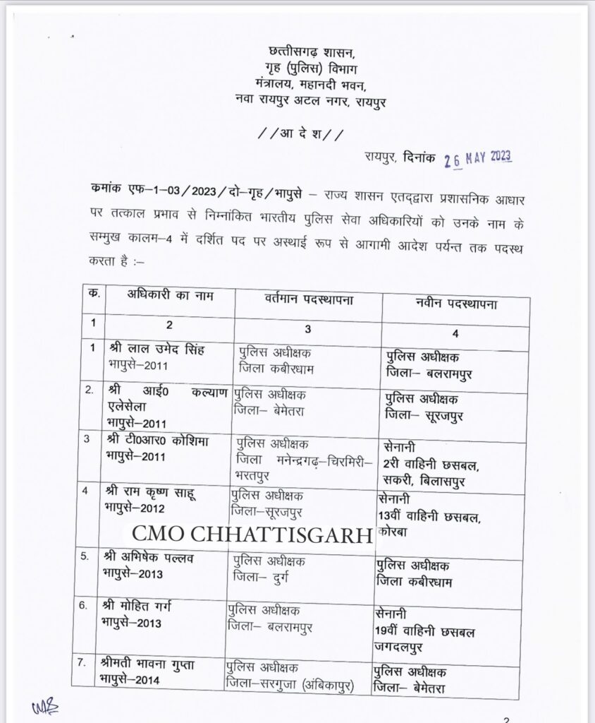 कबीरधाम के एसपी डॉ. लाल उमेंद सिंह को बलरामपुर जिला की कमान सौंपी गई है। बेमेतरा एसपी आई. कल्याण एलेसेला को सरगुजा संभाग के सूरजपुर जिला की जिम्मेदारी सौंपी गई है। वहीं, मनेंद्रगढ़- चिरमिरी जिला के एसपी टीआर कोशिमा को राज्य सशस्त्र बल की दूसरी वाहिनी का सेनानी बनाया गया है। इस वाहिनी का मुख्यालय बिलासपुर में है।