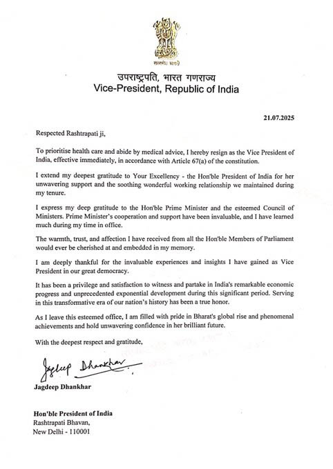 जगदीप धनखड़ ने उप राष्‍ट्रपति के पद से इस्‍तीफा देते हुए इसकी वजह स्‍वास्‍थ्‍यगत कारण बताया है। अपने इस्‍तीफा में उन्‍होंने राष्‍ट्रपति, प्रधानमंत्री और मंत्रिपरिषद का आभार व्‍यक्‍त किया है।