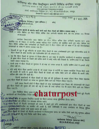 Meter Reader रायपुर। छत्‍तीसगढ़ की सरकारी बिजली कंपनी में कार्यरत मीटर रीडरों की तरफ से कंपनी प्रबंधन को सौंपे गए ज्ञापन का बड़ा असर हुआ है। कंपनी के कार्यपालक निदेशक ( संचार- संधारण) ने कंपनी के कार्यपालक निदेशक व मुख्‍य अभियंता को मीटर रीडरों की समस्‍याओं के समाधान के लिए लेटर जारी किया है।