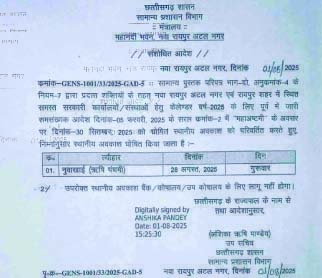छत्तीसगढ़ सरकार ने 28 अगस्त को अवकाश की घोषणा कर दी है। सामान्य प्रशासन विभाग से जारी आदेश के अनुसार छत्तीसगढ़ में 28 अगस्त को स्थानीय अवकाश रहेगा।