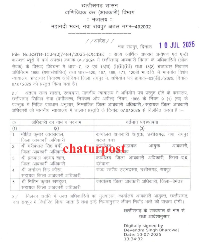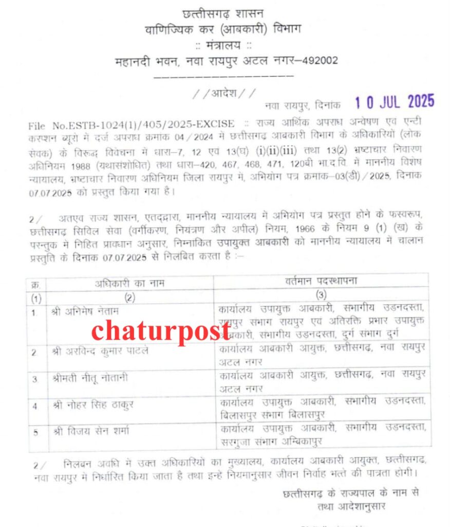 Nilamban रायपुर। छत्तीसगढ़ सरकार ने 22 अफसरों को एक साथ निलंबित कर दिया है। निलंबित किए गए अफसरों में उपायुक्त, सहायक आयुक्त और जिला आबकारी अधिकारी शामिल हैं। इनके निलंबन का आदेश जारी हो चुका है।