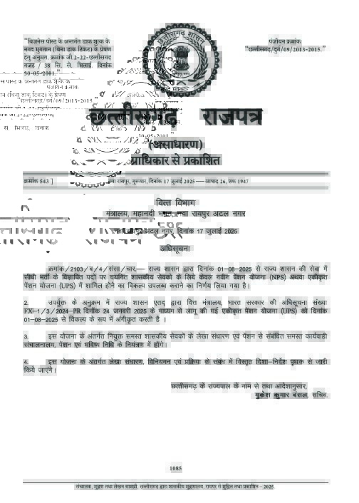 वित्त विभाग की तरफ से 17 जुलाई 2025 को प्रकाशित गजट नोटिफिकेशन में कहा गया है कि छत्तीसगढ़ में शासकीय सेवकों के सामने पेंशन के लिए न्यू पेंशन स्कीम NPS और एकीकृत पेंशन योजना UPS यही दो विकल्प रहेगा।