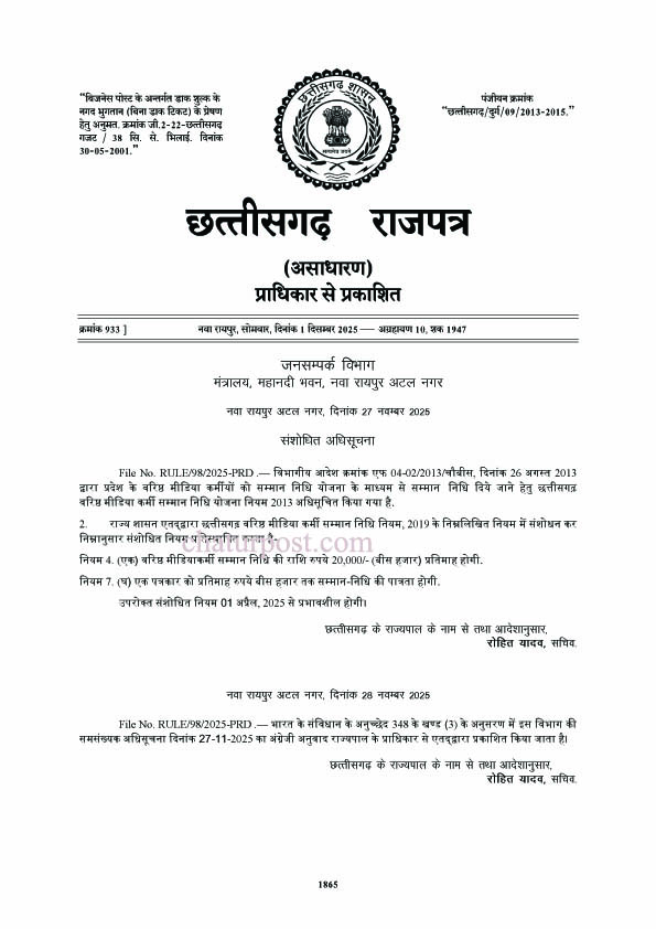 छत्तीसगढ़ सरकार ने इस संशोधन के जरिये वरिष्ठ पत्रकारों दिए जाने वाले सम्मान निधि को बढ़ा दिया है। जनसंपर्क विभाग की तरफ से एक दिसंबर को इसकी अधिसूचना जारी कर दी गई है।