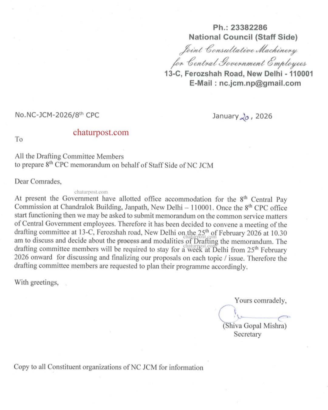 सचिव ने लिखा है कि ड्राफ्टिंग कमेटी के सदस्यों को हर विषय/मुद्दे पर हमारे प्रस्तावों पर चर्चा करने और उन्हें अंतिम रूप देने के लिए 25 फरवरी 2026 से एक हफ्ते के लिए दिल्ली में रुकना होगा। इसलिए ड्राफ्टिंग कमेटी के सदस्यों से अनुरोध है कि वे अपना कार्यक्रम उसी हिसाब से प्लान करें।