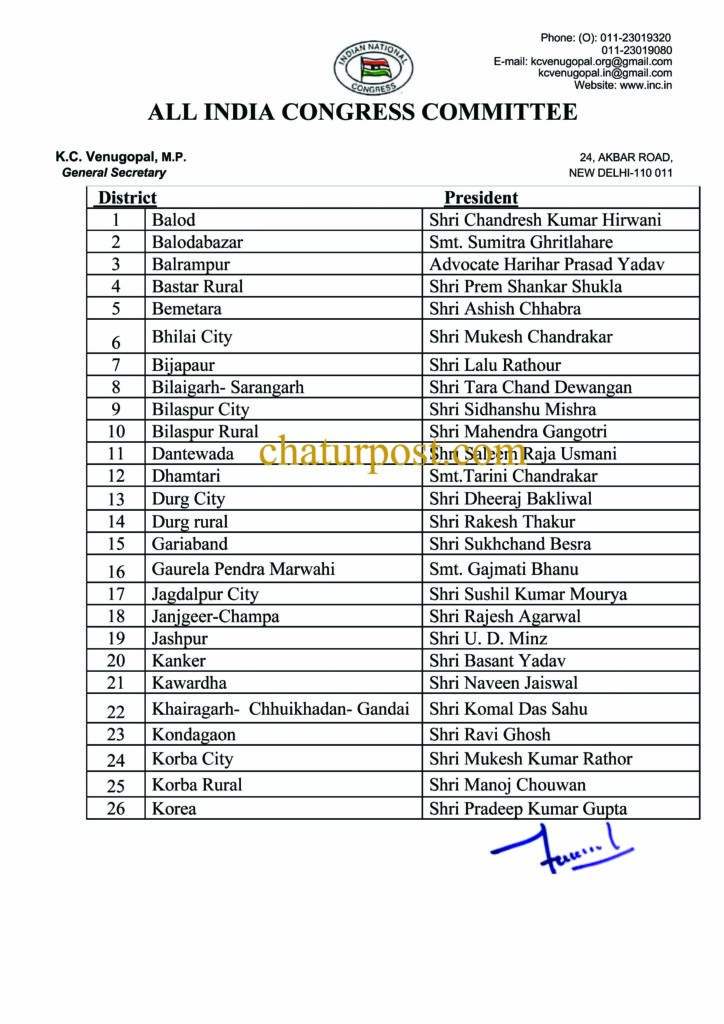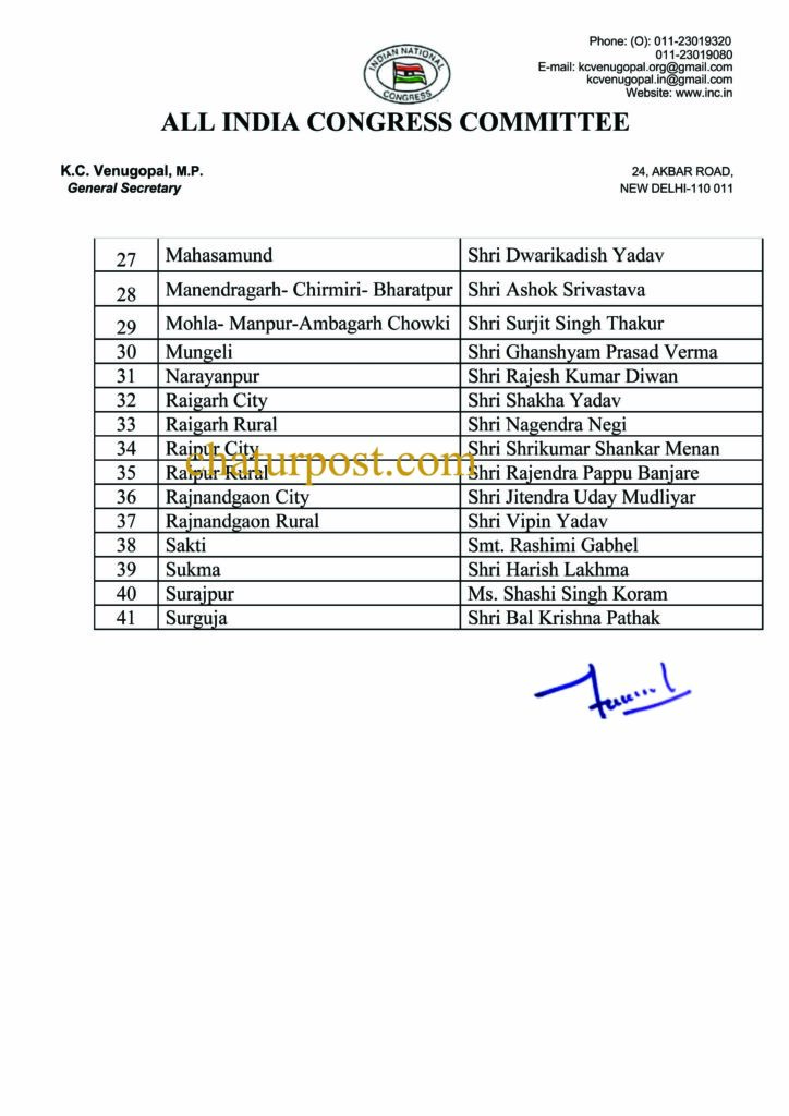 PCC रायपुर। छत्तीसगढ़ कांग्रेस ने अपने 41 संगठन जिलों के अध्यक्षों की सूची जारी कर दी है। पार्टी ने जेल में बंद विधायक और पूर्व आबकारी मंत्री कवासी लखमा के पुत्र हरिश लखमा को सुकमा का जिला अध्यक्ष बनाया है। 41 में पांच जिलों की कमान महिलाओं को सौंपी गई है।