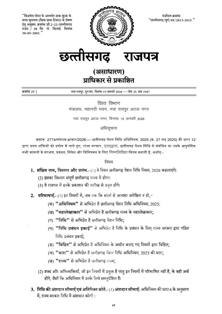Pension Fund Rules रायपुर। छत्तीसगढ़ सरकार ने नया पेंशन निधि नियम 2026 जारी कर दिया है। राजपत्र में प्रकाशन के साथ ही यह लागू कर दिया गया है।