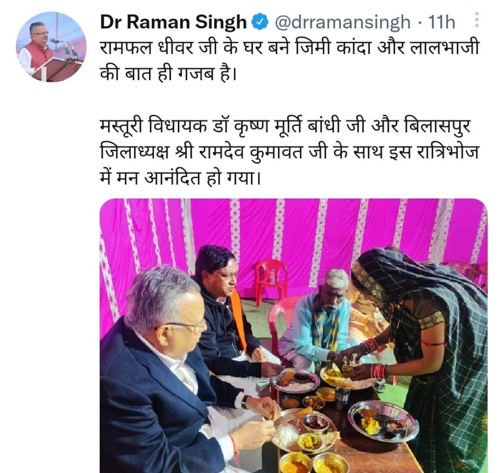 ताजा बयानबाजी का दौर गरीब के यहां भोज को लेकर है। पूर्व मुख्यमंत्री डॉ. रमन सिंह ने ट्विटर पर अपना एक फोटो साझा किया है। फोटो में पूर्व मुख्यमंत्री किसी के यहां भोजन करते दिख रहे हैं। फोटो के साथ डॉ. रमन ने लिखा है- रामफल धीवर जी के घर बने जिमी कांदा और लालभाजी की बात ही गजब है। मस्तूरी विधायक डॉ. कृष्णूर्ति बांधी जी और बिलासपुर जिलाध्यक्ष श्री रामदेव कुमावत जी के साथ इस रात्रिभोज में मन आनंदित हो गया।