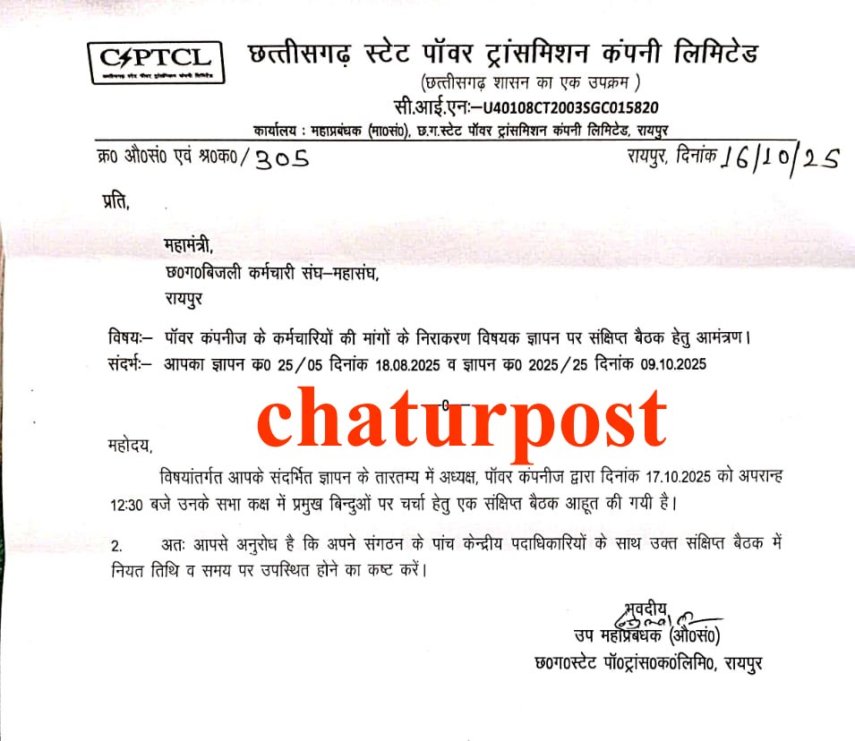 Power Company रायपुर। छत्तीसगढ़ की सरकारी विद्युत कंपनी में अक्टूबर में एक और छुट्टी की घोषणा की गई है। इस संबंध में पावर कंपनी प्रबंधन ने आदेश भी जारी कर दिया है।