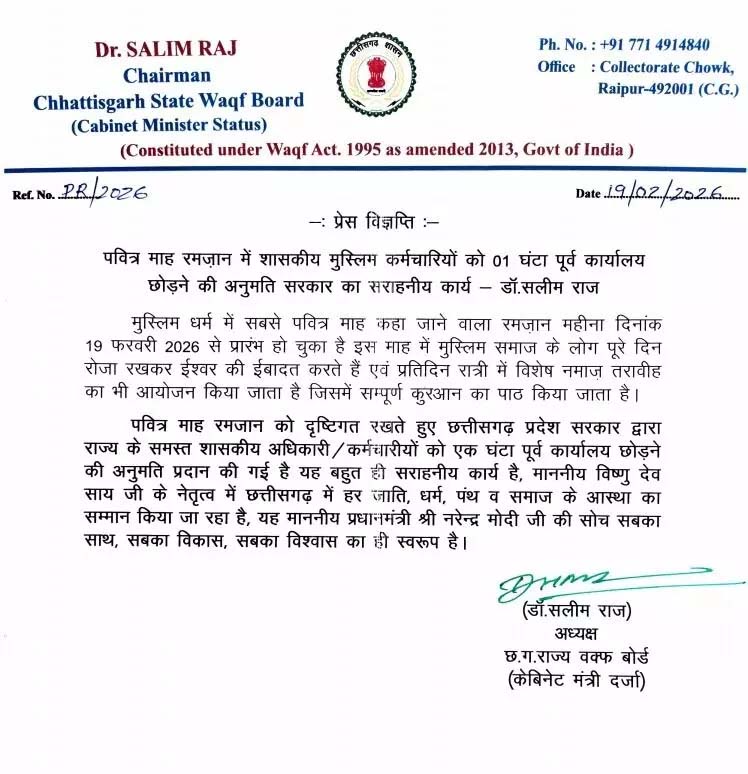 छत्तीसगढ़ के शासकीय कार्यालयों में रमजान की वजह से एक घंटा पहले छुट्टी देने का फैसला किया है। छत्तीसगढ़ Waqf बोर्ड के चेयरमैन डॉ. सलीम राज ने बताया कि सरकार ने पवित्र माह रमज़ान में शासकीय मुस्लिम कर्मचारियों को 01 घंटा पहले कार्यालय छोड़ने की अनुमति दी है।