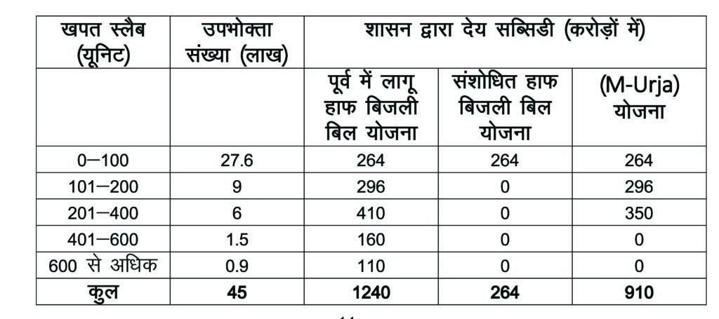 मुख्यमंत्री ऊर्जा राहत जन-अभियान (एम-ऊर्जा) घरेलू उपभोक्ताओं को प्रतिमाह 400 यूनिट तक की विद्युत खपत पर प्रथम 200 यूनिट में बिल की राशि में 50 प्रतिशत की छूट