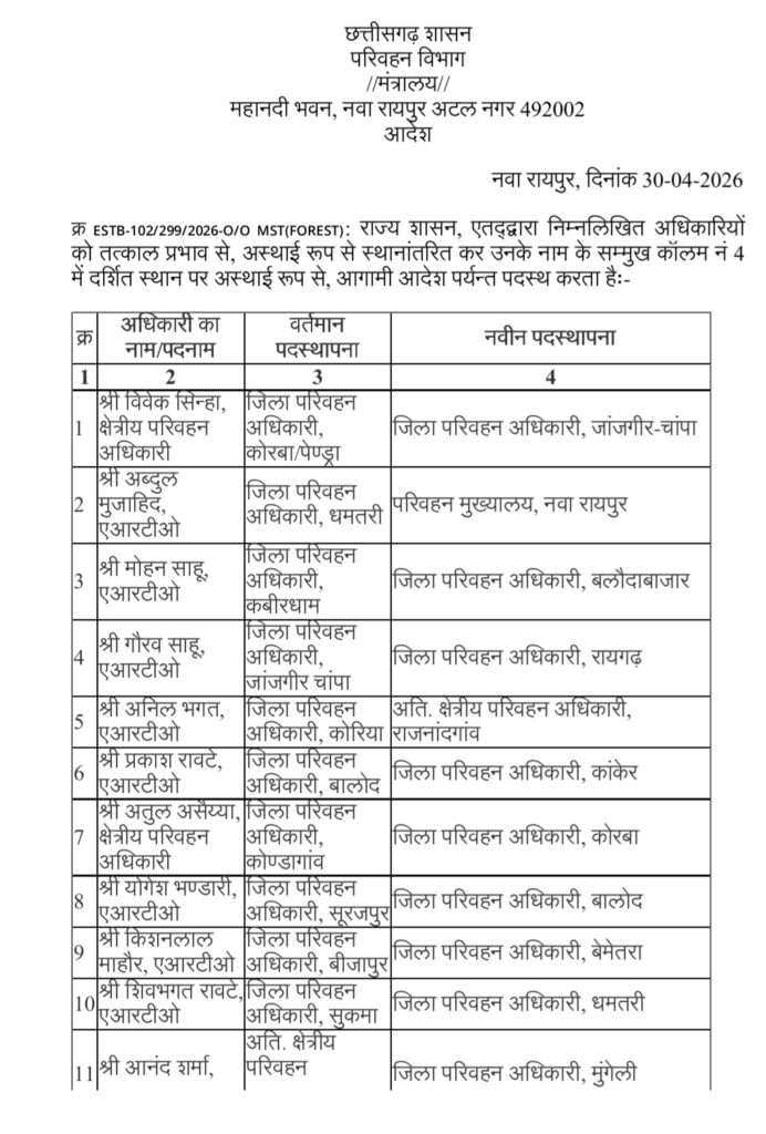 | 18 | श्री अरविंद भगत, एआरटीओ | जिला परिवहन अधिकारी, बेमेतरा | जिला परिवहन अधिकारी, जशपुर |