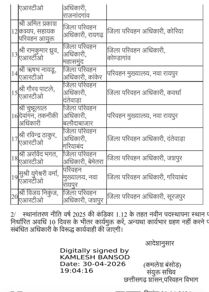 | 20 | श्री विजय निकुंज, एआरटीओ | जिला परिवहन अधिकारी, जशपुर | जिला परिवहन अधिकारी, सूरजपुर |