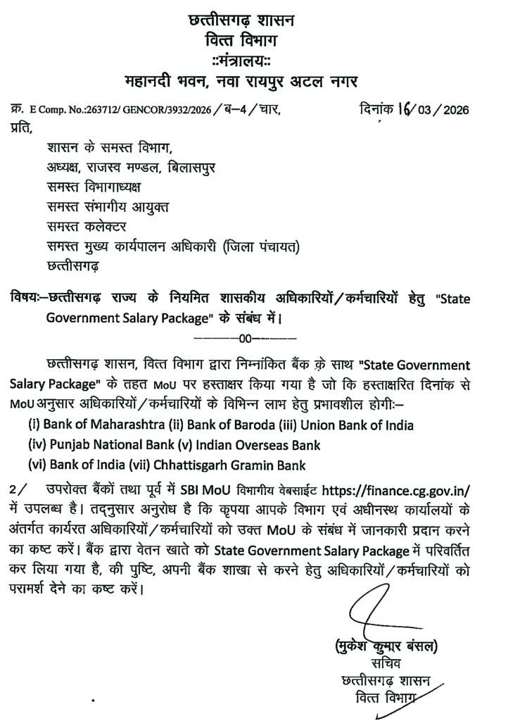 इन बैंकों के साथ सरकार ने शासकीय सेवकों के सैलरी पैकेज के लिए MOU किया है। वित्त सचिव ने अपने पत्र में विभाग प्रमुखों से आग्रह किया है कि आपके विभाग और अधीनस्थ कार्यालयों के अंतर्गत कार्यरत अधिकारियों / कर्मचारियों को उक्त MoU के संबंध में जानकारी प्रदान करने का कष्ट करें। बैंक द्वारा वेतन खाते को State Government Salary Package में परिवर्तित कर लिया गया है, की पुष्टि, अपनी बैंक शाखा से करने के लिए अधिकारियों/कर्मचारियों को परामर्श देने का कष्ट करें।