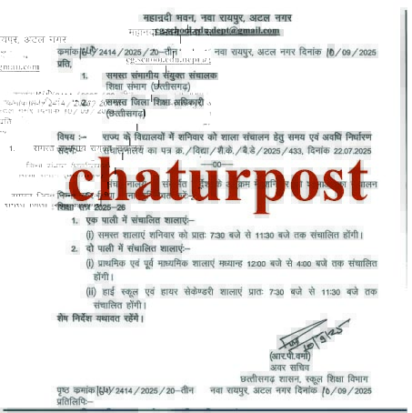स्कूलों की टाइमिंग में बदला को लेकर आदेश स्कूल शिक्षा विभाग के अवसर सचिव आरपी वर्मा के हस्ताक्षर से जारी किया गया है। इसमें शनिवार को स्कूलों के समय में बदलाव किया गया है।