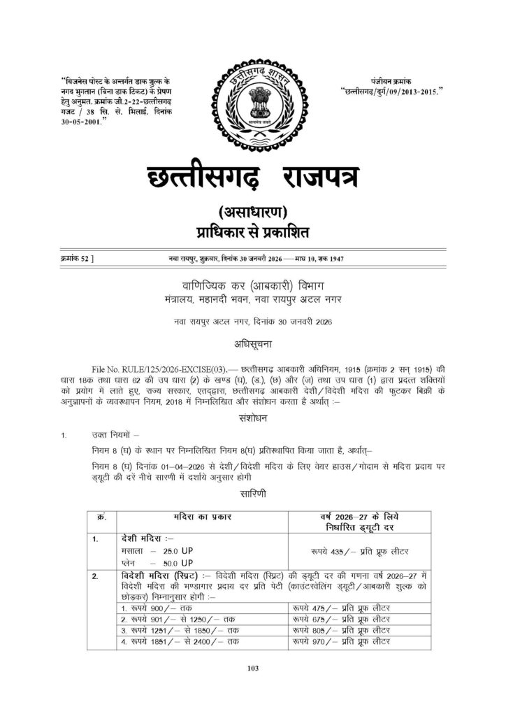Sharab ki Kimat रायपुर। एक अप्रैल 2026 से शुरू हो रहे नए वित्तीय वर्ष में छत्तीसगढ़ में शराब के कारोबार में कुछ बदलाव की तैयारी है। 1 अप्रैल से सरकार नई आबकारी नीति लागू करने जा रही है। इसमें शराब की कीमतों से लेकर उसकी पैकिंग तक में बदलाव की तैयारी है।