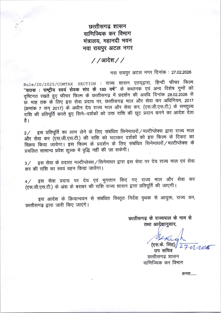 सरकार की तरफ से जारी आदेश में कहा गया है कि फिल्म के कथानक और अन्य विशेष गुणों को दृष्टिगत रखते हुए फीचर फिल्म के छत्तीसगढ़ में प्रदर्शन की अवधि 28 फरवरी 2026 से छः माह तक के लिए इस सेवा प्रदाय पर, छत्तीसगढ़ माल और सेवा कर अधिनियम, 2017 के अधीन देय राज्य माल और सेवा कर. (एस.जी.एस.टी.) के समतुल्य राशि की प्रतिपूर्ति करते हुए सिने दर्शकों को उक्त राशि की छूट प्रदान करने का आदेश देता है।