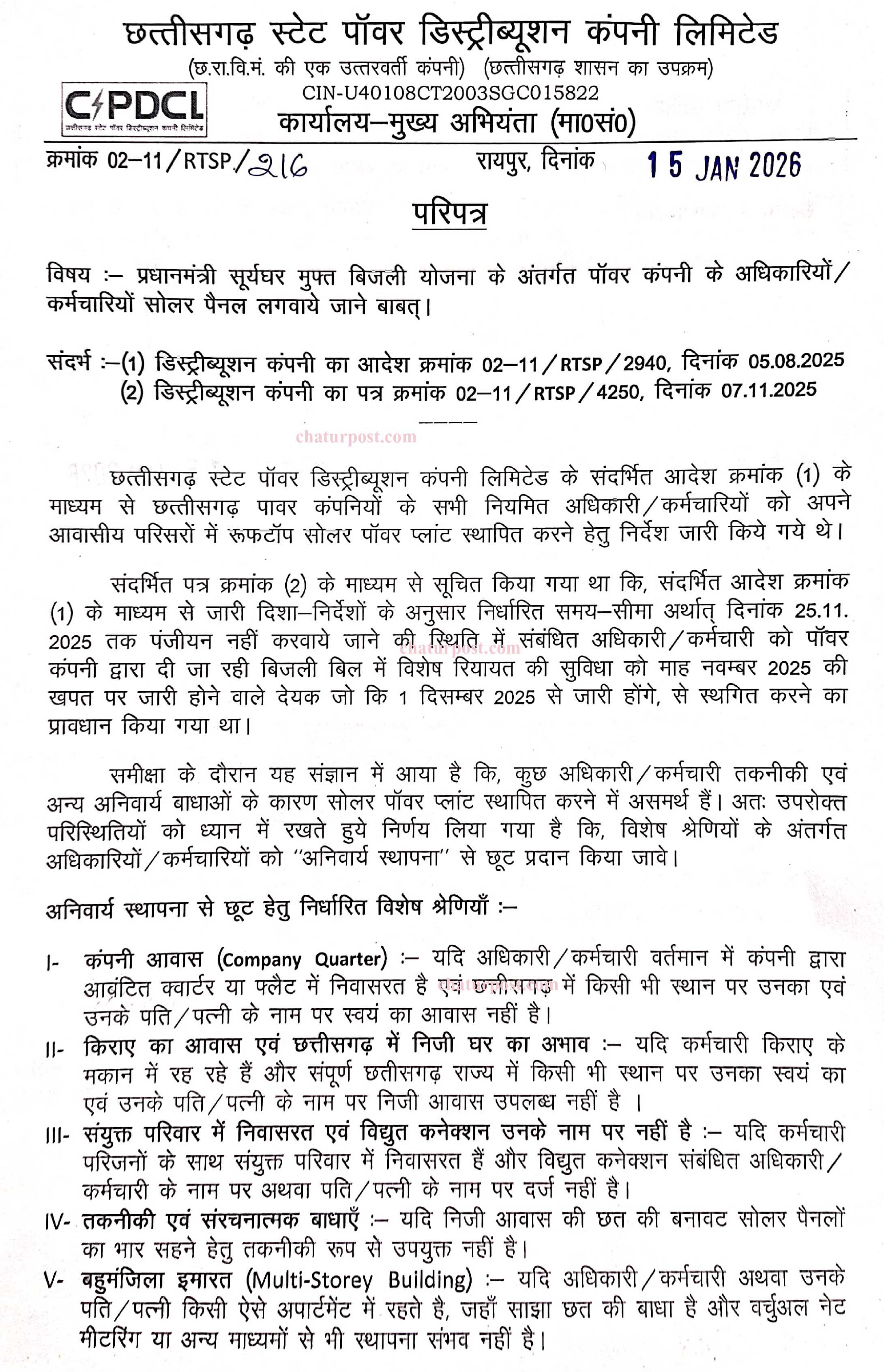 Solar panel रायपुर। छत्तीसगढ़ स्टेट पॉवर डिस्ट्रीब्यूशन कंपनी लिमिटेड ने छत्तीसगढ़ पावर कंपनियों के सभी नियमित अधिकारी और कर्मचारियों के लिए आवासीय परिसरों में रूफटॉप सोलर पॉवर प्लांट स्थापित करने की अनिवार्यता खत्म कर दी है। कंपनी प्रबंधन ने कुछ शर्तों के साथ यह राहत देने का फैसला किया है।
