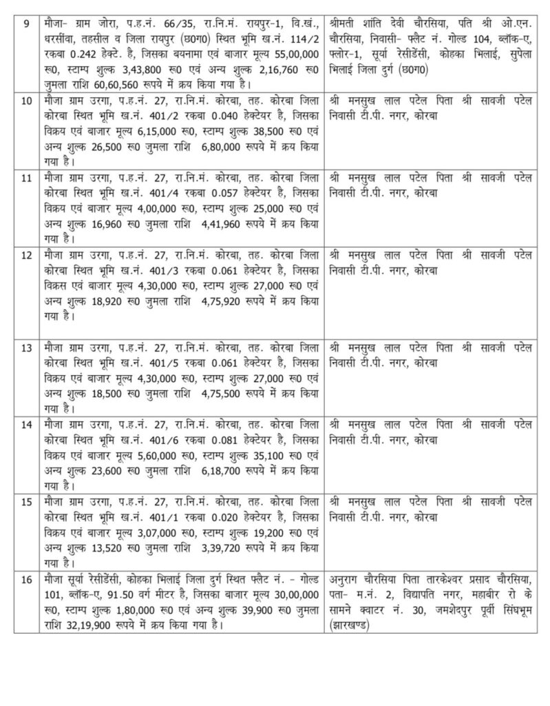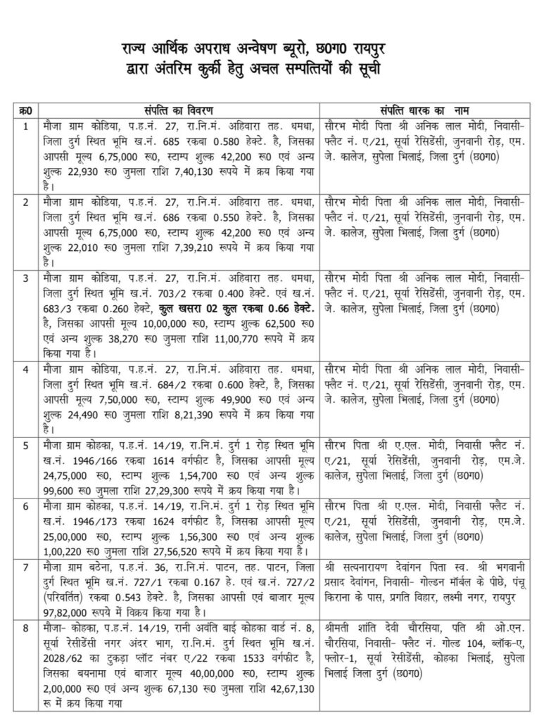 बाकी बची 16 अचल सम्पत्तियों को राज्य आर्थिक अपराध अन्वेषण ब्यूरो, रायपुर के द्वारा भ्रष्ट माध्यमों से अर्जित किये जाने के पुष्टिकृत साक्ष्य पाये जाने से 16.06.2025 को विशेष न्यायालय में दण्ड विधि संशोधन अध्यादेश 1944 में लिखित प्रावधानों के तहत् कुर्की किये जाने के लिए आवेदन प्रस्तुत किया गया था, जिसकी सुनवाई करते हुए विशेष न्यायालय रायपुर ने 22.09.2025 को उक्त 16 अचल सम्पत्तियों, जिनका मूल्य लगभग 08 करोड़ रुपए है, को अंतरिम कुर्की किए जाने का आदेश पारित किया गया है।