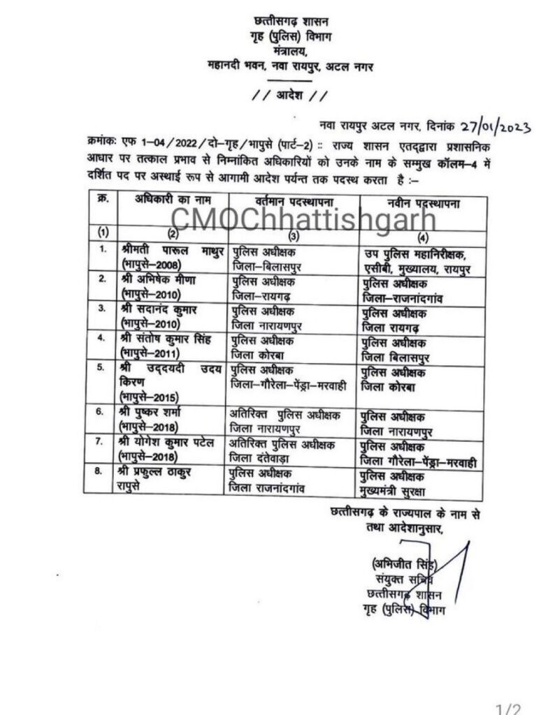 गृह विभाग से जारी सूची के अनुसार बिलासपुर एसएसपी पारुल माथुर को डीआईजी एसीबी मुख्यालय बनाया गया है।