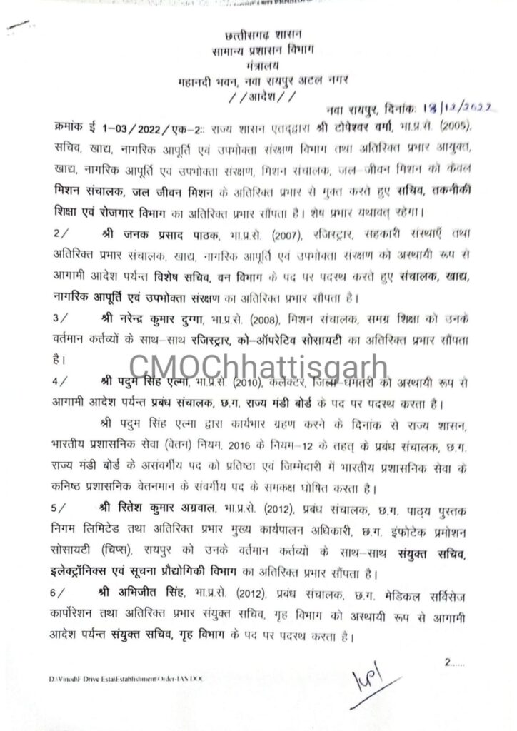 टोपेश्वर वर्मा IAS सचिव खाद्य, नागरिक आपूर्ति एवं उपभोक्ता संरक्षण विभाग, अतिरिक्त प्रभार आयुक्त खाद्य नागरीक आपूर्ति एवं उपभोक्ता संरक्षण, मिशन संचालक जल जीवन मिशन को केवल मिशन संचालक जल जीवन मिशन के अतिरिक्त प्रभार से मुक्त करते हुए सचिव तकनीकी शिक्षा एवं रोजगार विभाग का अतिरिक्त प्रभार सौंपा गया है।