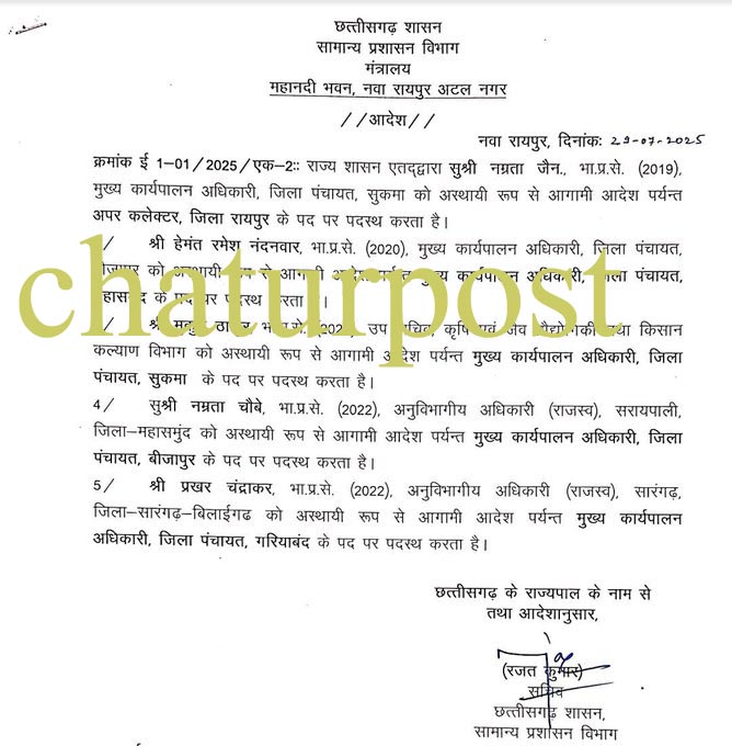 नम्रता चौबे बीजापुर जिला पंचायत में पदस्थ किया गया है। इसी तरह प्रखर चंद्राकर गरियाबंद जिला पंचायत का सीएमओ पदस्थ किया गया है।