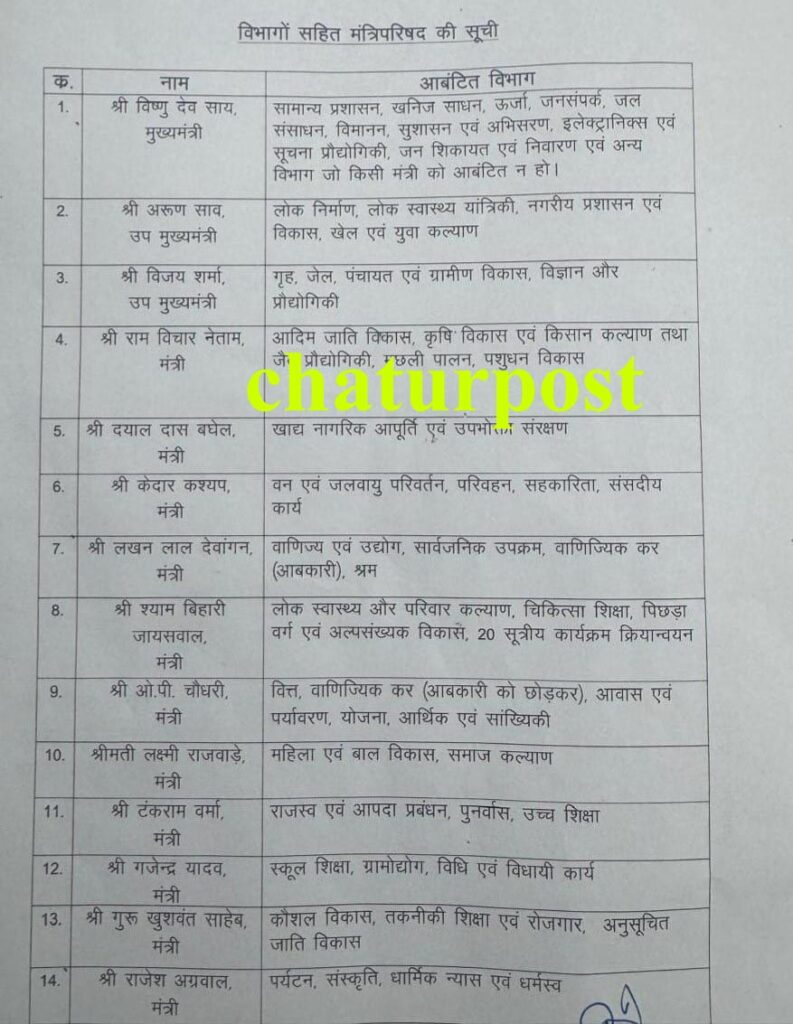 | विष्णु देव साय | मुख्यमंत्री | सामान्य प्रशासन, खनिज साधन, ऊर्जा, जनसंपर्क, जल संसाधन, विमानन, सुशासन एवं अभिसरण, इलेक्ट्रानिक्स एवं सूचना प्रौद्योगिकी, जन शिकायत एवं निवारण एवं अन्य विभाग जो किसी मंत्री को आवंटित न हो। |